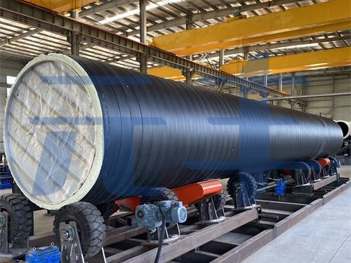 酯噴涂環(huán)節(jié)。鋼管隨著具有角度的滾輪上勻速行進,聚氨酯噴槍將組合料以傘形、霧狀,均勻噴涂在螺旋前進 的鋼